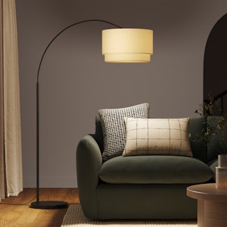 A light that's ahead of the curve. The Zebu tall floor lamp features a taut double-shade in a lovely textured linen. Suspended from a powder-coated black frame, this is a light that's as elegant as its owner (is that... you?).